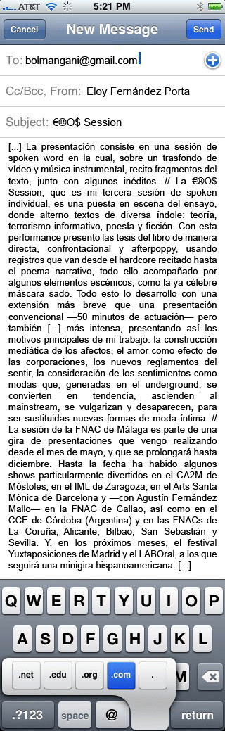 Hace un par de semanas recibà una invitación de Eloy Fernández Porta para asistir a la presentación de €®O$: La superproducción de los afectos, premio Anagrama de Ensayo 2010. Asà decÃa Eloy: